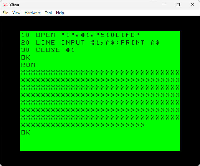If you run that, it will eventually try to read (and take a really long time) before erroring out with ?IE ERROR. Add “75 PRINT #1” to insert an ENTER at the end of the PRINT loop, and then it will just take a really long time trying to read, and print the first 249 characters of that 65,025 character string.