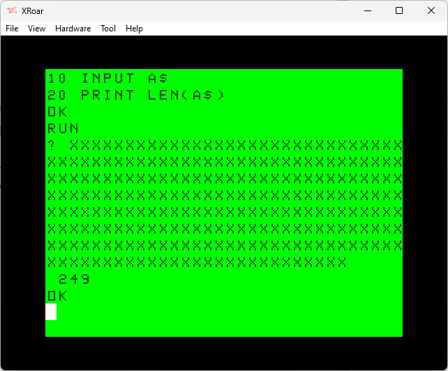 Even if the input buffer were larger, the largest string variable you can have is 255 characters, so that would be the maximum input size to avoid an ?LS ERROR (length of string). Here’s a short program to verify that, which uses the STRING$() function to create a string of a specified length containing a specified character.